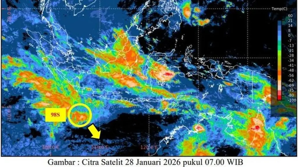 Badan Meteorologi, Klimatologi, dan Geofisika (BMKG) menginformasikan adanya pembentukan bibit siklon tropis baru yang berpotensi memengaruhi cuaca di sejumlah wilayah Indonesia. Bibit siklon tropis dengan nomor identifikasi 98S ini terdeteksi pada Rabu, 28 Januari 2026, pukul 01.00 WIB.