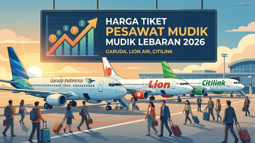 Harga tiket pesawat mudik Lebaran 2026 menjadi perhatian utama jutaan pemudik yang berencana pulang kampung menjelang Hari Raya Idul Fitri. Setiap tahun, lonjakan permintaan penerbangan domestik mendorong kenaikan harga tiket secara signifikan. Tiga maskapai besar — Garuda Indonesia, Lion Air, dan Citilink — menawarkan tarif yang bervariasi untuk rute-rute populer seperti Jakarta–Surabaya, Jakarta–Yogyakarta, dan Jakarta–Medan.