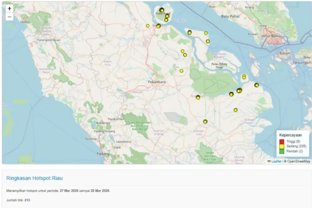 Realita Bengkulu – Badan Meteorologi, Klimatologi, dan Geofisika (BMKG) Stasiun Pekanbaru mendeteksi 213 titik panas di Provinsi Riau per 28 Maret 2026. Deteksi ini mencerminkan situasi kritis kebakaran hutan dan lahan yang terus mengancam kawasan Sumatera, dengan Kabupaten Bengkalis mencatat angka tertinggi sebesar 91 titik panas.