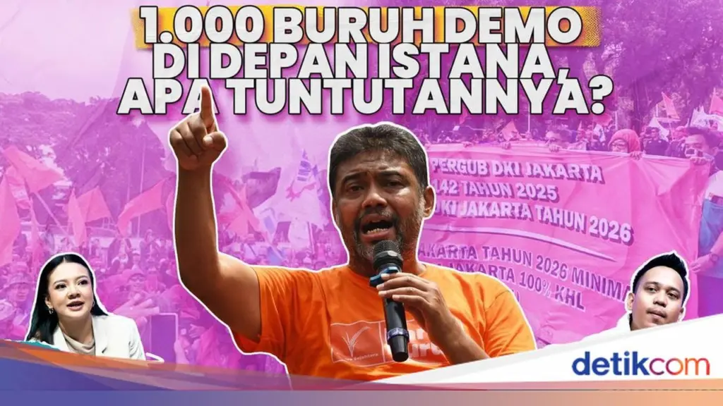 Ribuan buruh dari Konfederasi Serikat Pekerja Indonesia (KSPI) bersama Partai Buruh menggelar aksi demonstrasi di depan Istana Merdeka, Jakarta, pada Senin (29/12/2025). Aksi ini merupakan buntut penolakan terhadap penetapan Upah Minimum Provinsi (UMP) DKI Jakarta tahun 2026 sebesar Rp 5,7 juta.